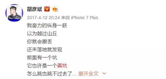 有趣的是,没过几天,胡彦斌就在微博上发了一条没头没尾的“跳粪坑”论。