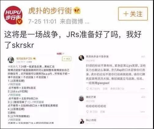 在吴亦凡的回击中,直接指明了虎扑那段视频是经过了“特殊处理跟消音”,言下之意就是虎扑er是在故意用假音频黑他,而在结尾吴亦凡更是大胆放话说“等着diss track”吧。作为拥有3230万粉丝的吴亦凡,此言论一出自然是一石激起千层浪,说唱圈歌手纷纷出场出歌diss,而吴亦凡好友潘玮柏也在微博中发声支持吴亦凡。对于虎扑步行街官微来说,粉丝关注人数暴涨,对于新说唱节目来说,“skr”如愿以偿的成为了流行热词。对于虎扑er来说,这场狂欢更是一场吊打“脑残粉”的娱乐活动。