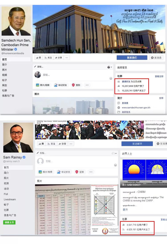 西有美国总统特朗普的“推特治国”,东有柬埔寨洪森在社交媒体脸书上塑造形象。如今,在脸书上的互动已经使洪森成为了全世界社交媒体参与度位列第三的领导人。据BBC2016年的报道,洪森的脸书账号开通于2015年9月。而截至2018年8月1日,洪森在脸书的粉丝早已突破一千万,点赞数也达一千万。但对手桑兰西的账号,无论点赞数还是关注人数,都不及洪森的二分之一。