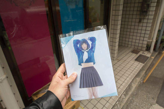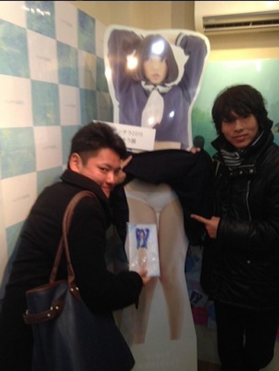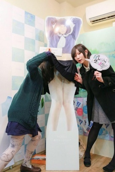 场馆一楼设有纪念照拍摄处,摆放着其中一名主办人生田真人大小的立板,“穿”着一条黑色迷你裙。