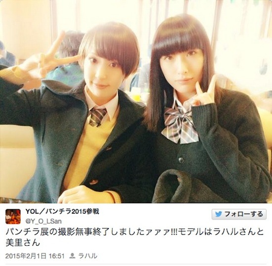 “内裤走光展的拍摄顺利结束!模特是Raharu和美里小姐。”