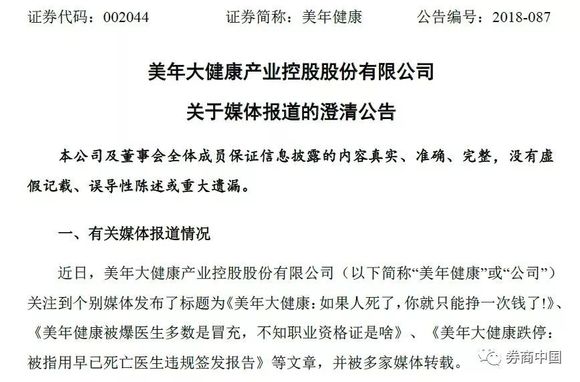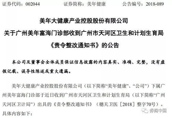 5天前美年健康回复深交所称,公司不存在无证上岗、持错证上岗或持过期证照上岗的情形。5日晚间,美年健康发布公告称,收到广州市天河区卫生和计划生育局的《责令整改通知书》。