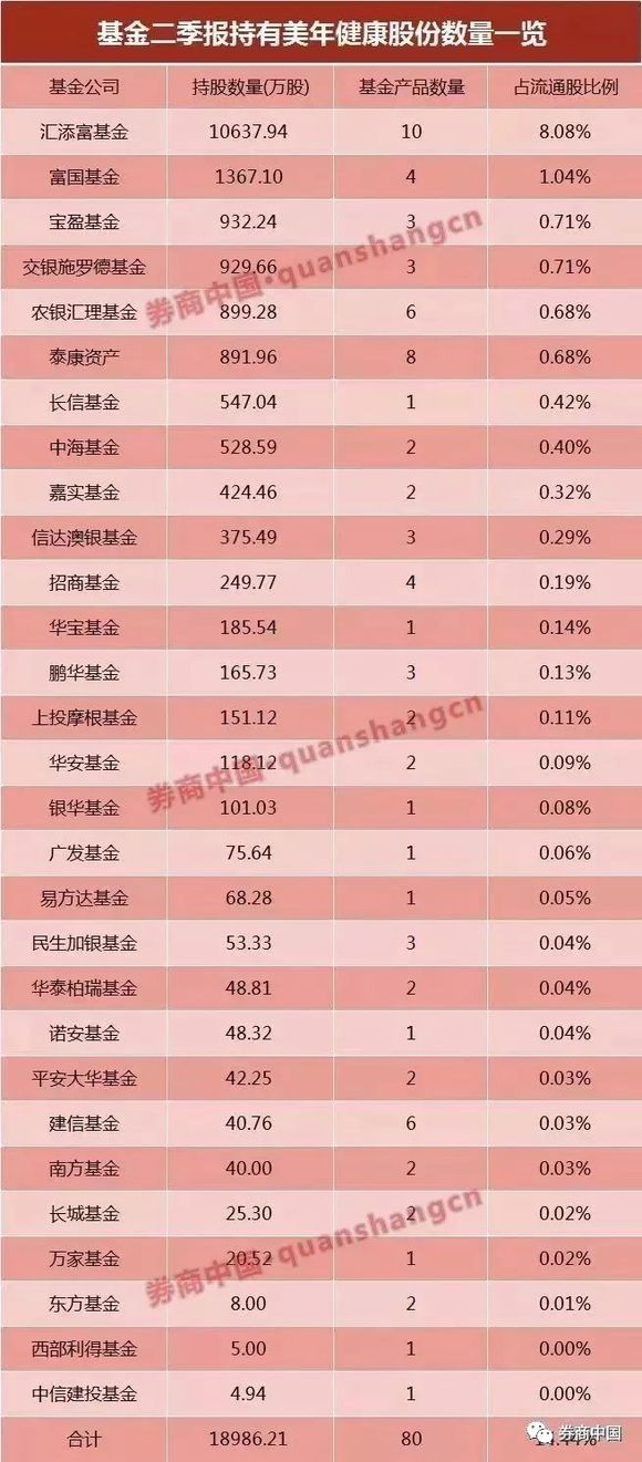 值得注意的是,作为专注于体检的上市公司在A股的标的并不多,美年健康获得了众多机构资金的青睐。以基金二季报数据来看,共有29家基金公司80只产品踩雷,合计持股1.9亿股,占流通股比例14.44%。