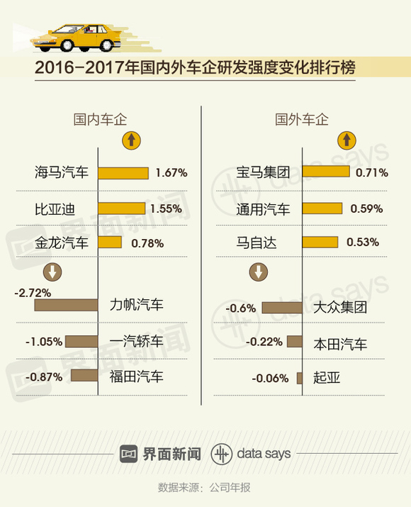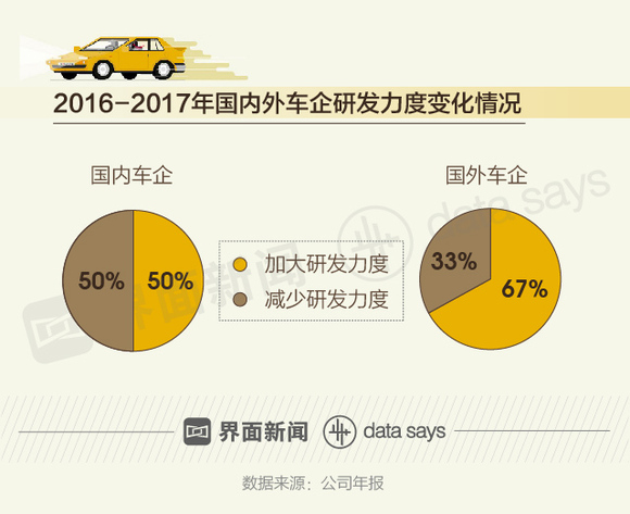 相较于2016年的数据,在2017年,国外车企比国内车企更愿意加大研发强度。