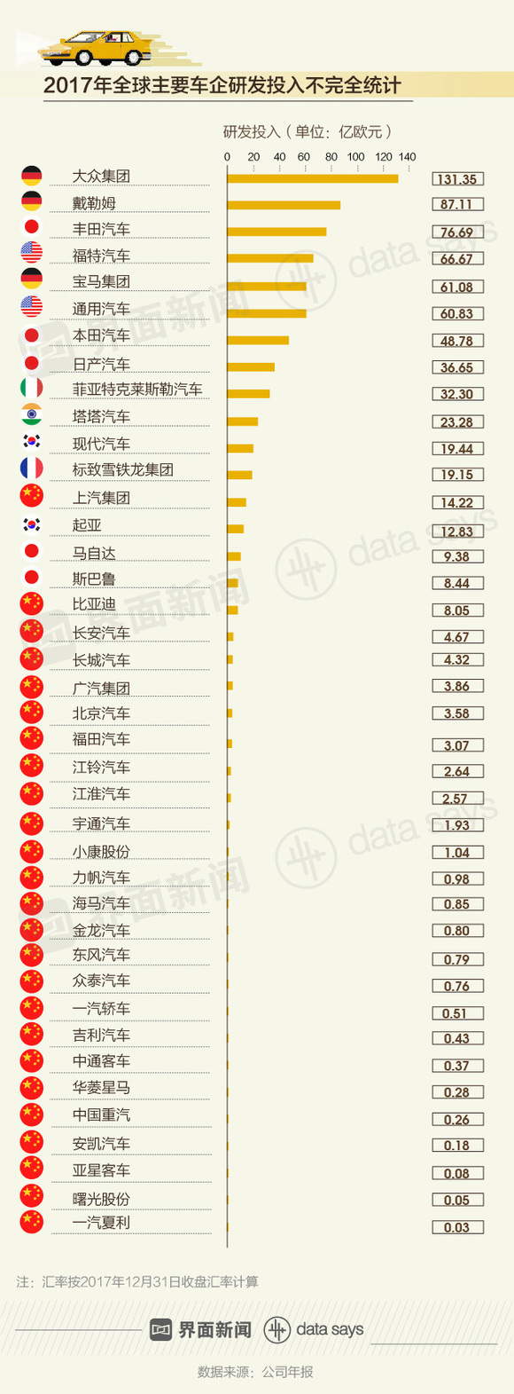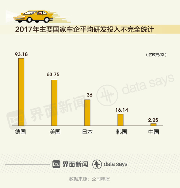 在2017年全球汽车研发投入排行榜上,德、日、美车企包揽前五。其中,大众集团以131.35亿欧元的研发投入排名第一,戴勒姆(旗下包括梅赛德斯-奔驰等)和丰田汽车分别以87.11亿欧元和76.69亿欧元紧随其后。中国车企在研发投入上远低于国外车企,其中投入最多的是上汽集团(600104.SH),2017年在研发上投入约14.22亿欧元。