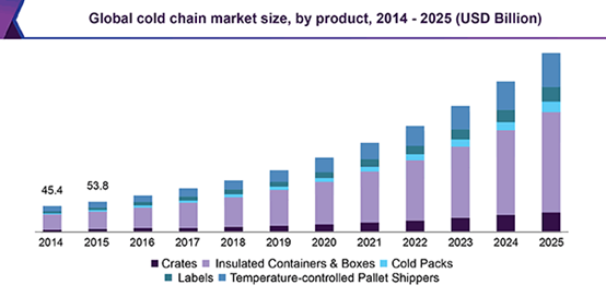 根据Grand View Research的研究数据,2017年,全球冷链市场的估值为1475.5亿美元,到2025年将达到4475.0亿美元,期间将保持以年复合增长率15.0%的速度增长。