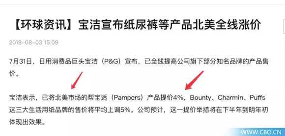日化巨头宝洁日前就宣布,将北美市场的帮宝适(Pampers)产品提价4%,Bounty、Charmin、Puffs这三大纸巾品牌的售价将平均上调5%。公司预计,这一提价举措将在下半年到明年初体现出效果。