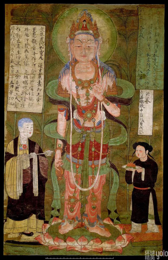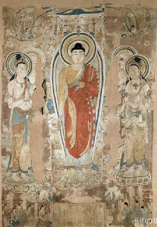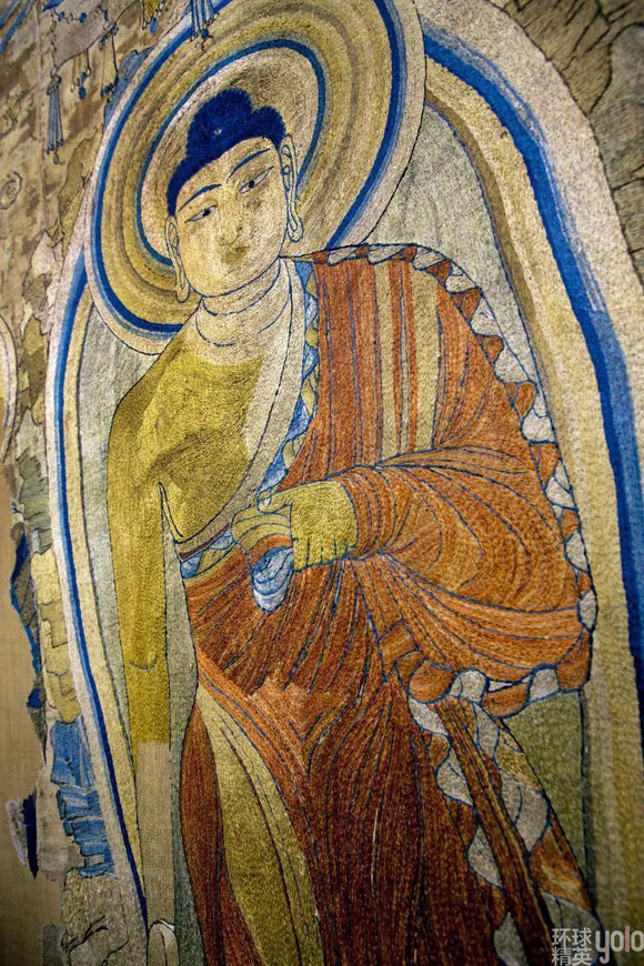 由于刺绣画曾长期叠放在藏经洞中,两尊菩萨的像已经有部分破损。值得欣慰的是,主尊释迦牟尼保存尚完好,破损严重的,是两尊菩萨背后只露出半身的两尊弟子像。这件巨幅刺绣是在斯坦因第二次中亚远征(1906-1908年)之后,于1919年入藏大英博物馆。