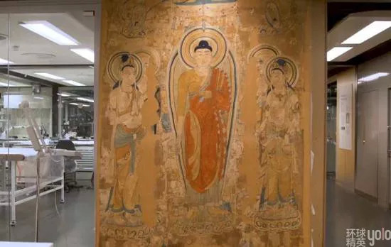 在敦煌文物中,相比于雕塑和壁画,有一类是很多人所不了解的,那就是用于节日盛典展示、可以装饰宫殿佛堂的巨大绢画。这些敦煌绢画大部分如今正存于斯坦因密室之中,与1900年从故宫养心殿流失的、东晋顾恺之《女史箴图》同在。修复、装裱后的敦煌绢画被框进木槽里,一排排嵌在墙壁上。