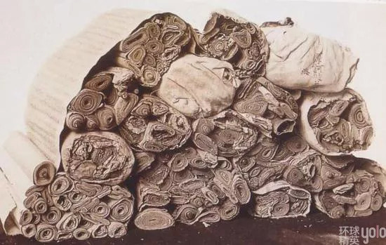 1907年的敦煌藏经洞以及摆在洞窟甬道上的经卷,上图中的经卷如今大部分存于大英图书馆