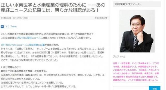 但由于过度宣传,富氢水似乎成为包治百病、无所不能的神水。随后,日本国立健康营养研究所在其官方网站上发布了一则消息表示,“并没有得出水素水有效性和安全性的数据”。太田成男也曾多次公开表示,富氢水对人体健康有一定用处,但不应过分夸大其功用。
