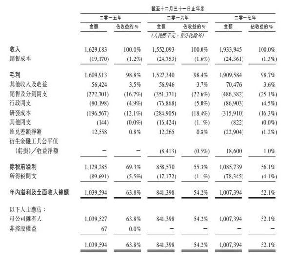 不谈毛利,即使是按净利润率来算,最近2017年它的净利润率也超过了60%,这个净利比例比很多游戏公司的毛利水平还要高很多,相比之下同期申请上市的美团净利润则为负的28.5亿元。