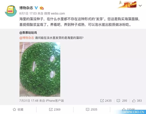 但在近5年,质疑该面膜“海藻”身份的言论频频在媒体曝光。8月4日,著名博物学科普杂志《博物杂志》的官方微博(以下简称“博物”)再次辟谣这类“海藻”面膜非真海藻,其真相更是令人大跌眼镜。