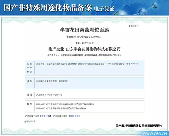 同时,记者在国家食品药品监督管理总局查询国产非特殊用途化妆品备案时发现,以淘宝排名靠前的几个品牌为例,一款半亩花田海藻颗粒面膜的成分是“藻提取物”;一款心主题 新小颗粒海藻面膜的成分是“淡黑巨海藻(LESSONIA NIGRESCENS)提取物”。