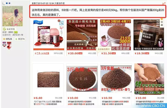 一袋数百克的“海藻籽”市场价往往不到50元,功效主打补水和缩小毛孔。海藻面膜的起源时间已无法考证,但早在10年前,该面膜就随着网购的崛起,因其低价位和奇特体验,在网购大军中颇具人气,销路广阔。