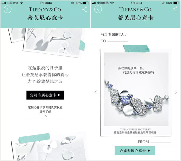 比如在今年2月份的春节和情人节期间,蒂芙尼就在微信投放了一则翻转式卡片广告,以“因爱之名,为爱点赞”的广告语引发了受众的广泛共鸣。