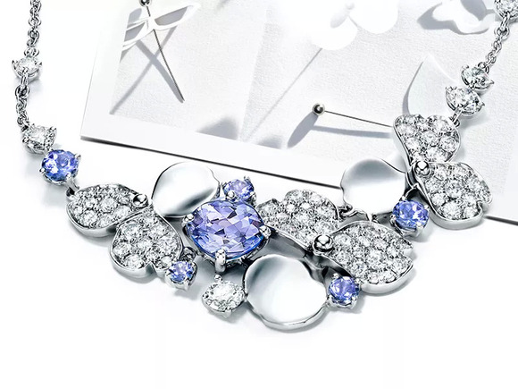 上图:全新 Tiffany Paper Flowers 花韵系列铂金镶嵌钻石及坦桑石项链