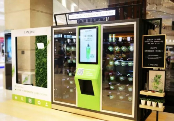 2016年的夏天,为了推广夏日新品水光润养系列,兰蔻在北京、上海等城市有品牌入驻的百货商场、shopping mall、电影院等地方搭建了共50多个机器人快闪店。该店周围装扮了一些绿色的植被,营造出清新的感觉。消费者只需用手机扫一扫商店上的二维码,关注兰蔻的官方微信号,接着输入手机号码,便会收到抽奖密码,将密码输入到商店的机器上,机器就会上下滚动并随意抓取水光瓶的试用装。