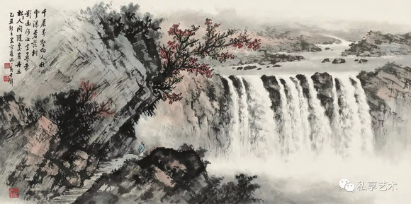 黄君璧先生的发现和努力是以现实为参 照,创造性地突破了中国传统绘画表现巨大瀑布这一自然奇观的局限,以宽阔的眼界和 胸怀,以成熟的笔墨和技法,既表现了三大 瀑布自然奇观中各具特点的形貌,又将中国 水墨画表现自然奇观的范围和能力作了开拓性的延伸和提升,反映出了水墨画的时代特 色。经过黄君璧先生的努力,世界著名的瀑 布所表现出的宏伟壮丽的自然景观进入到中 国现代山水的体系中,而他的历史性贡献在这一时段的显现,引领了他衰年的艺术发展 走向了人生的艺术高峰,进入到他艺术历程 中的第四个历史阶段。
