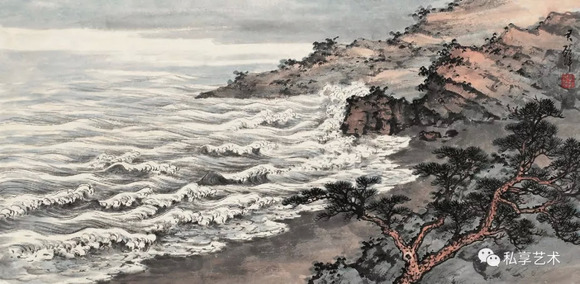 同一时期,因为大海不断出现在黄君璧先生的视野之中,关于大 海的图像从他寓居台湾以来就成为其与台湾相关的新的图式。他将与海洋相关的浪涛、礁石、岸边的松树以及通过画的表现才能够听到的 涛声,作了不同方式和不同可能的组合。虽然浪涛是新的画法,而礁 石等同于山石,与松树的结合则是他最为擅长的内容,因此,在这种新的题材中,黄君 璧先生同样将传统水墨的表现作了淋漓尽致 的发挥,使之在新内容的图像中依然焕发出 传统笔墨的神采。