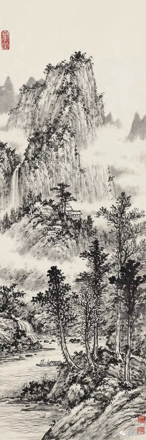 黄君璧 深岭溯溪舟 纸本水墨 89cm×30cm 20 世纪 60 年代