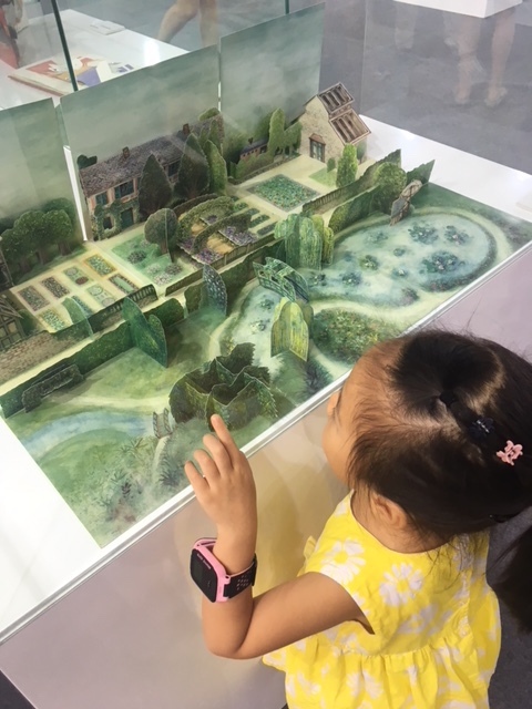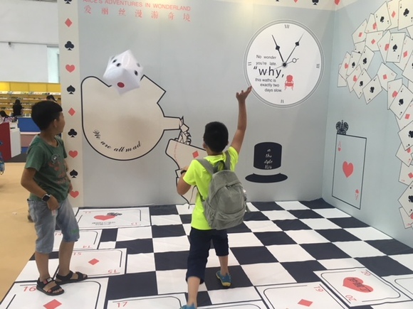 在绘本展的展区内部,除了原创绘本、立体书以外,还有一些有趣的主题。有经典故事主题:孩子们可以扮演小红帽和狼外婆,也可以投掷骰子玩“爱丽丝漫游奇境”;有科普主题:恐龙、海底世界、四季故事,每个主题都可以通过游戏来学习;图博会还与经济科学出版社合作,设置了职业体验区,让孩子们懂得货币的意义,体会赚钱的辛苦。绘本展里,有的孩子在奔跑玩耍,有的坐在坐垫上玩玩具,还有的眨巴着眼睛听父母朗读故事。