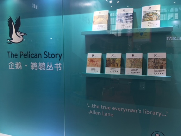 企鹅兰登、剑桥、牛津等出版社等我们熟知的外国出版社都在这里。企鹅兰登的外墙是企鹅与中国版权交易的成果:中信出版集团的“小黑书” (Penguin Little Black Classics)套装、上海文艺出版社的鹈鹕丛书、未读的莎士比亚改写系列、安徽少年儿童出版社的小猪佩奇系列……这些大众已经十分熟悉的书目到达中国读者的手中必须通过版权交易,这也是图博会的职能所在。