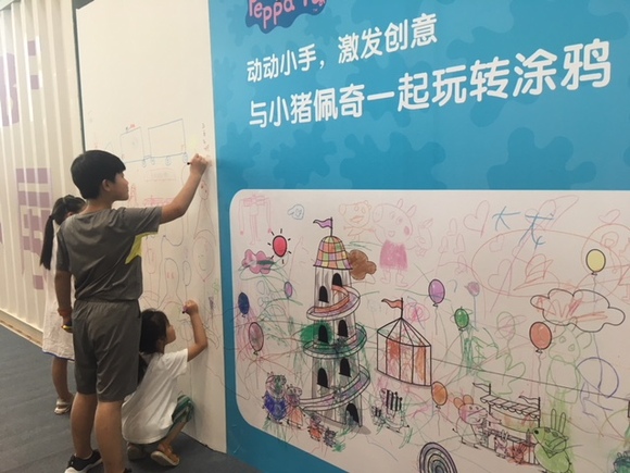 相较于专业展区东二区,西四区的绘本展更适合孩子玩耍。这是要额外购买门票的展览。绘本展的外墙已经成为了孩子们的涂鸦墙,孩子们在这儿一笔一画勾勒出心中的童话。