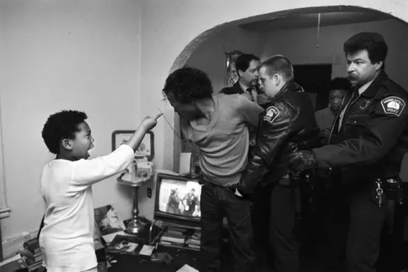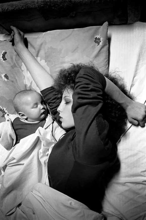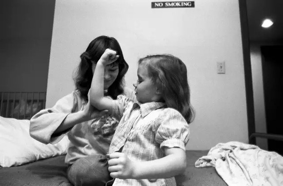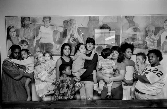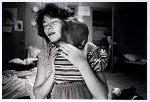 1988年,明尼苏达州,Donna Ferrato 让受虐者住在避难所里,和她的女儿呆在一起。她回到学校拍摄吸毒者的孩子。