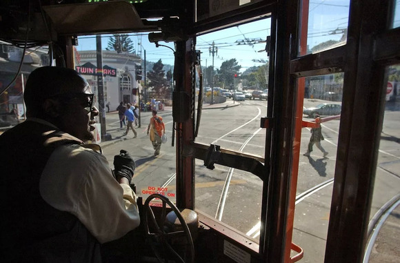 旧金山一名有轨电车驾驶员正在开车(照片:美联社)