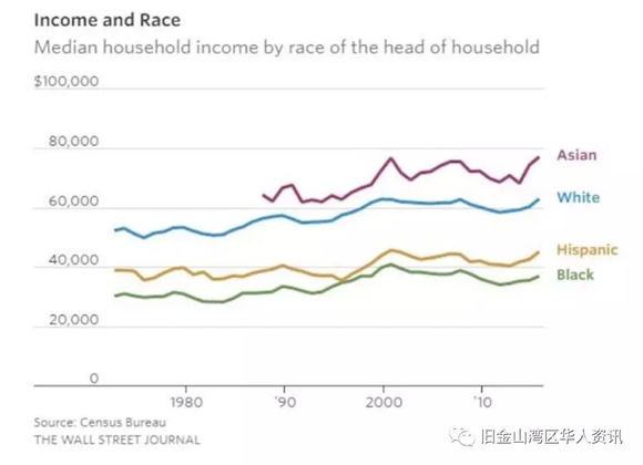 据纽约时报报道,美国华裔家庭收入中位数约$7.0万,远高于美国白人家庭收入中位数$5.96万。
