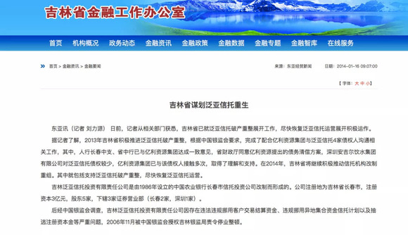 吉林省金融办官网亦证实了该消息,称亿利集团已与泛亚信托的四家债权人进行了沟通并获得支持。债务清偿方案也获得了省财政厅同意。