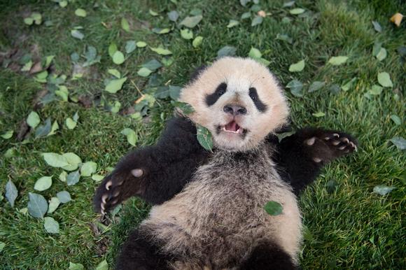 四川大熊猫保护研究中心碧峰峡基地,一只大熊猫宝宝躺在草地上。