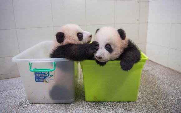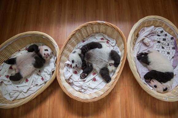 三个月的熊猫宝宝躺在碧峰峡的熊猫保育室中休息。如果一位熊猫妈妈生了一对双胞胎,她通常无法给予两只熊猫宝宝同样的关注。饲养员会定期交换熊猫宝宝的位置——确保它们既能得到饲养员也能得到熊猫妈妈的同等关爱。