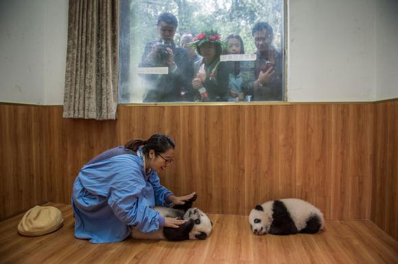 碧峰峡基地,饲养员刘娟(音译)正在游客的观看下,和一对熊猫宝宝进行互动。