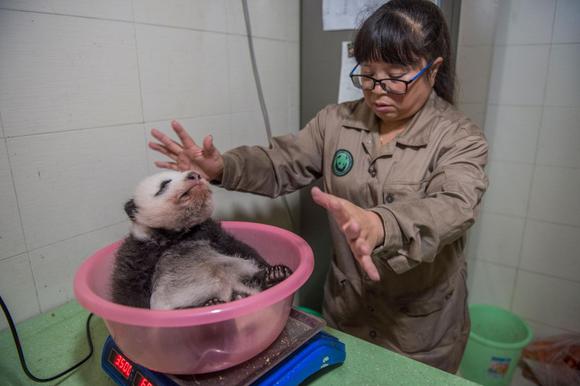 碧峰峡基地饲养员张欣(音译)在称一只熊猫宝宝的体重。“我们会关注成年熊猫以及熊猫宝宝每一天的状态,它们吃了多少,它们粑粑的状态,它们精神好不好,等等。我们唯一的愿望就是它们能健健康康,”她说。