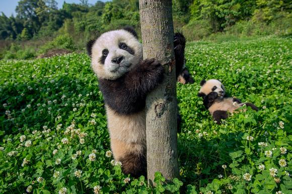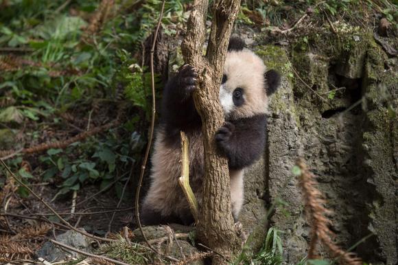 六个月的熊猫宝宝正在都江堰基地里玩耍。满一岁后,熊猫宝宝会被带到这里交朋友。这些熊猫会在保护区里长大,如果在野外,大熊猫会更喜欢独居。