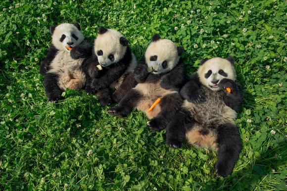 都江堰基地,几只六个月大的熊猫正在啃胡萝卜。