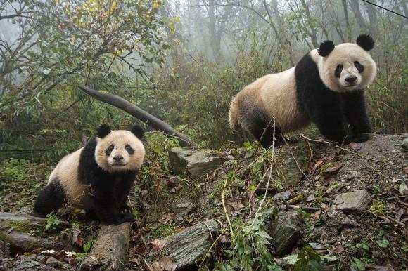 卧龙基地,叶叶(音译)正在和两岁的宝宝花椒(音译)探索自己的地盘。没有人类插手,叶叶能够慢慢教会宝宝如何在野外生存。