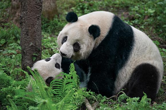 一位熊猫妈妈和她的宝宝正在卧龙保护区内玩耍。如果饲养员认为熊猫宝宝适合在野外独自生存,例如它能够识别敌人,那么饲养员就会安排这只熊猫重回野外。