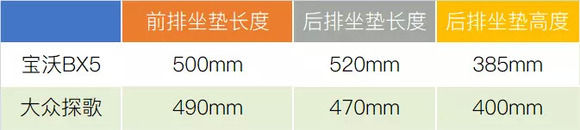 在比较直接的车内空间对比上,宝沃虽然轴距仅比大众车型多微不足道的5mm,但前后排的腿部空间都有较大优势,直观上给人更好的感受。而且BX5在同样装有全景天窗的情况下,后排的高度也比探歌多40mm,改善了后座乘客的体验。