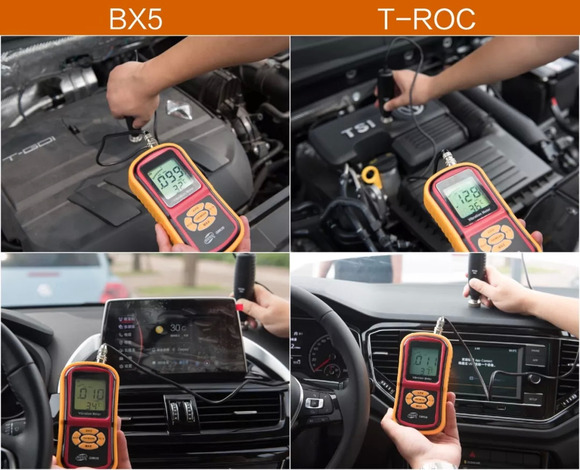 已经行驶3000公里的宝沃BX5在这个环节有些许优势,最后我们测试出的最低值仅有0.02mg/m3,大幅低于0.10 mg/m3的国家标准。不过驾仕派仅跑了700多公里的大众探歌,情况就没有这么乐观,在检测中它达到了0.11 mg/m3,虽然仅是刚超标的程度,但也确实落后于宝沃车型。好消息是这部探歌的空调具备空气净化功能,在开启后我们再进行测试,这项数值就回到0.03,让新车主可以改善用车环境。