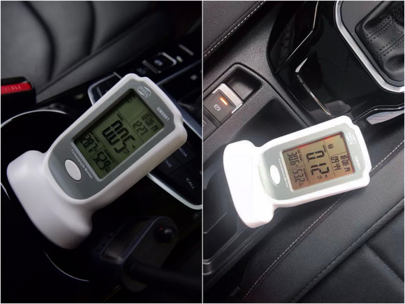 最后我们还针对两部车的车内环境进行了甲醛测试,具体方式是将车密闭停放在户外停车场一个小时,然后立刻进入车内开始检测。原本我们期望能有烈日当空,可以测试到高温下的有害气体溢出,但恰巧试驾当天的气温格外温和,所以只能录取两款车型在32度左右室温下的表现。