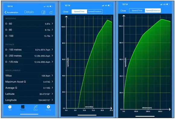 加速测试中,我们保持电子辅助设备开启,使用D挡弹射起步,并以全油门方式持续加速到110kph,取得0-60、80、100kph的数据。