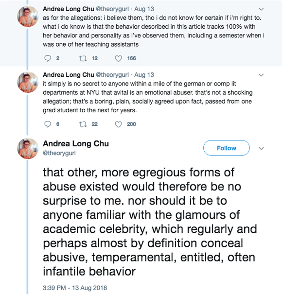 在8月25日《纽约客》发表的评论中,作者Masha Gessen采访了罗内尔一门课程的助教Andrea Long Chu,Chu曾在社交网络上表示相信赖特曼的指控。Chu指出,罗内尔一直有一种被害妄想,因此格外需要身边人的保护,需要他们奉承她、安抚她,因此她也许认为,赖特曼是真心出于爱和仰慕才会选择与她进入这样一段关系。Chu认为,正是这种受害者心态,将罗内尔与其他觉得自己可以随便睡学生的男性捕猎者区分开来,因为在学界这样一个厌女症十分严重的环境中,作为一名女性和一名酷儿,罗内尔很可能真的受到过迫害。