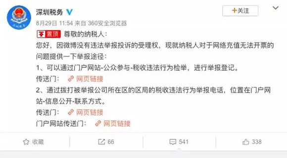 因此,根据《发票管理办法》的规定,当玩家完成充值后,游戏厂商作为收款方,应当是有义务向付款方开具发票的。游戏厂商拒绝开具发票的,玩家们完全可以向税务机关举报。事实上,玩家们就已经“攻占”了深圳税务局的官微,纷纷留言举报腾讯。为此深圳税务还特地发博指导玩家们如何进行有效举报。