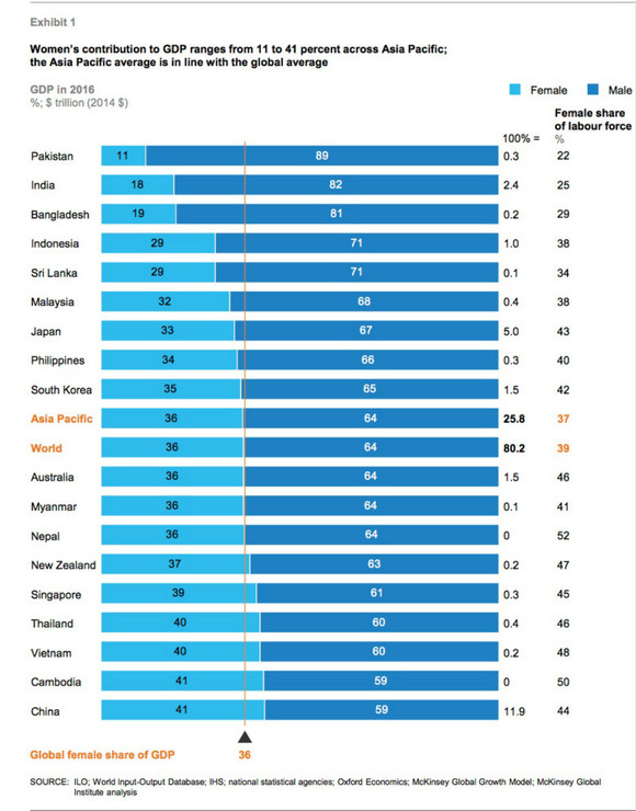该报告脱胎于麦肯锡于2015年发布的性别不平等全球报告。根据那份报告,提升女性平等能够在2025年为全球带来12万亿美元的额外经济增长,也就是说,在未来十年里,全球每个地区都有望获得8%到16%的GDP增长。作为全球经济的重要引擎,亚太地区有极大的潜力在性别平等中获益。在全球范围内及亚太地区,女性劳动力对GDP的平均贡献值为36%。在亚太地区,中国地区的女性劳动力GDP贡献率最高,达到41%。