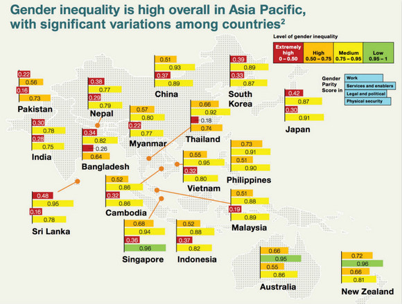 在社会性别平等方面,澳大利亚、新西兰、菲律宾和新加坡在教育、生育、金融和数字服务方面处于地区最佳位置,孟加拉国、印度、尼泊尔和巴基斯坦仍然有长足的进步空间。女性人身安全与自主依然是亚太地区多数国家及全球的重大挑战。