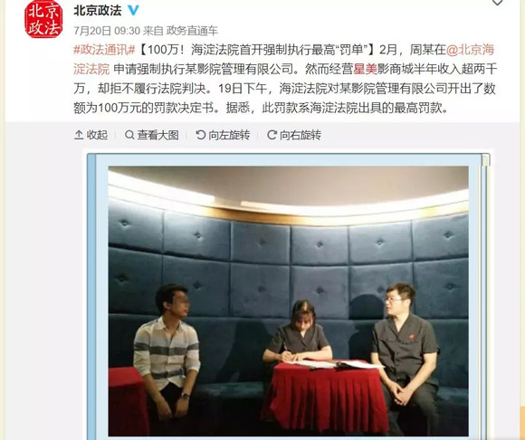 比如今年7月20日,北京海淀法院对星美开100万元的强制执行“罚单”,原因是账上有钱,却不还。