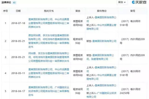 首先,星美在全国各地的影院拖欠租金和物业费用的情况越来越严重,天眼查数据显示,星美国际影院有限公司涉及到的法律诉讼多达40条,近几个月的诉讼案由多为房屋租赁纠纷。